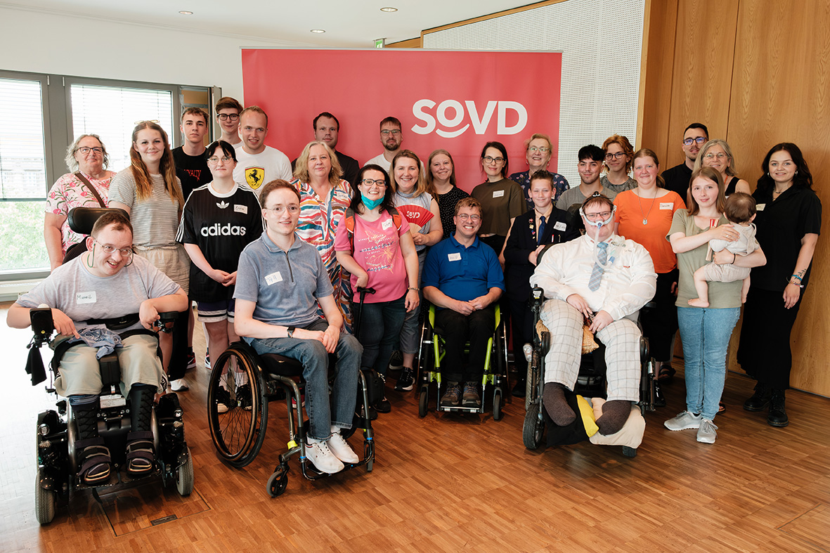 Gruppe junger Menschen vor einem roten SoVD-Aufsteller.